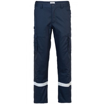 Pantalón modelo cargo (bolsillos laterales), cintura semielasticada, bolsillos traseros con tapeta, cinta gris en piernas y excelente calce.