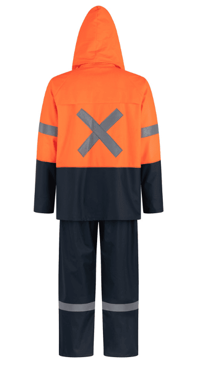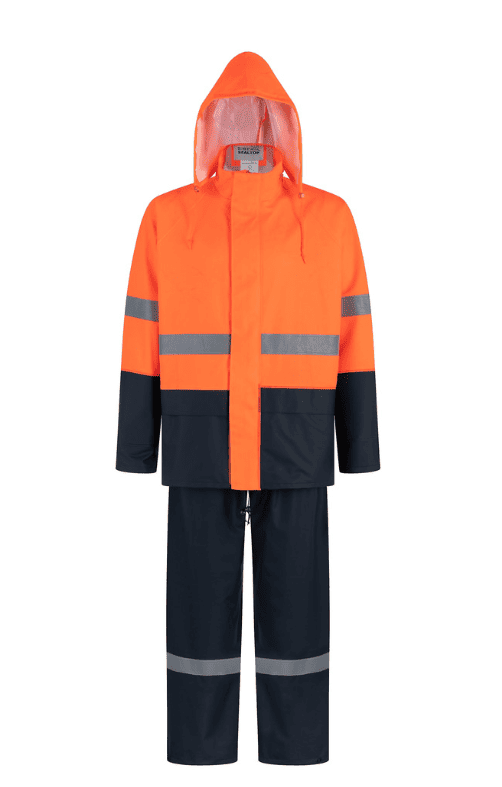 Set de 2 piezas: Chaqueta y Pantalón. Posee cintas reflectantes de 2 pulgada de alta visibilidad.